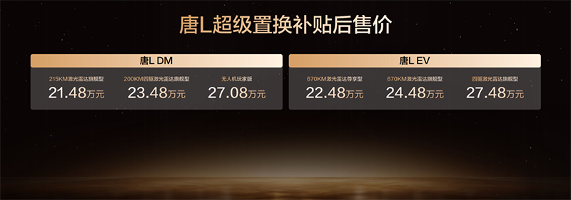 此次,唐L EV 3款车型,补贴后售价22.48万~27.48万元;唐L DM 3款车型,补贴后售价21.48万~27.08万元;同时,比亚迪还为用户准备了包含置换补贴在内的至高价值4.5万元尊享礼遇,让旗舰体验触手可及。
