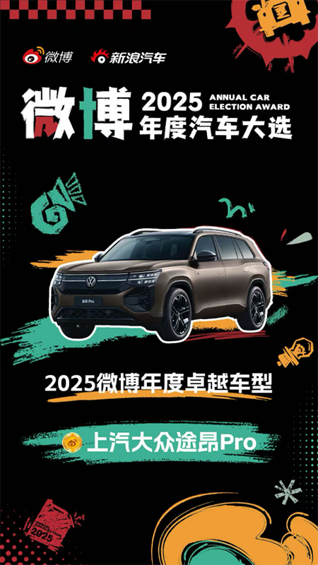 荣耀满载,初心不改。途昂 Pro将继续以卓越产品力,陪伴更多用户,共赴每一程广阔天地。欢迎广大消费者前往上汽大众授权经销商,体验“2025微博年度卓越车型”的硬核魅力。